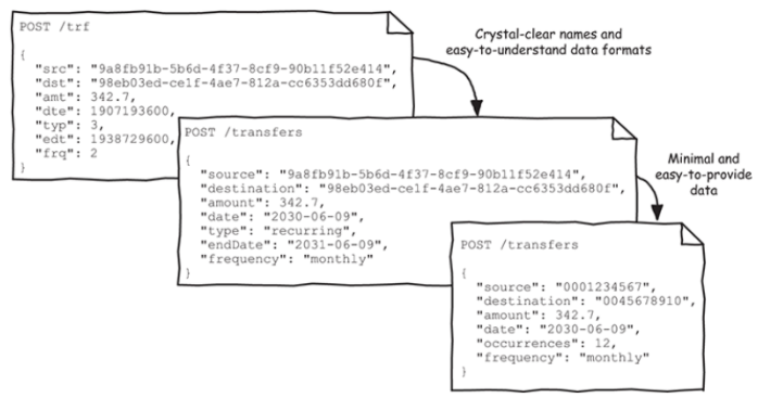 데이터를 표현함에 있어 이름은 직관적이면 좋다. 예를 들어 bkAccOverProtFtActBln 이 이름만 듣고 무엇인지 감이 오는가 ? 이것을 좀 더 직관적으로 바꾸면 bankAccountOverdraftProtectionFeatureActiveBln 이다. 이것을 좀 더 간략하게 사용할 수 있다. 예를 들어 이 API가 bankAccount에 관련된 API이면 overdraftProtectionFeatureActiveBln이라고 쓸 수 있다. 또한 이 속성의 타입이 boolean인것을 감안하면 overdraftProtectionFeatureActive 으로 사용 가능하다.