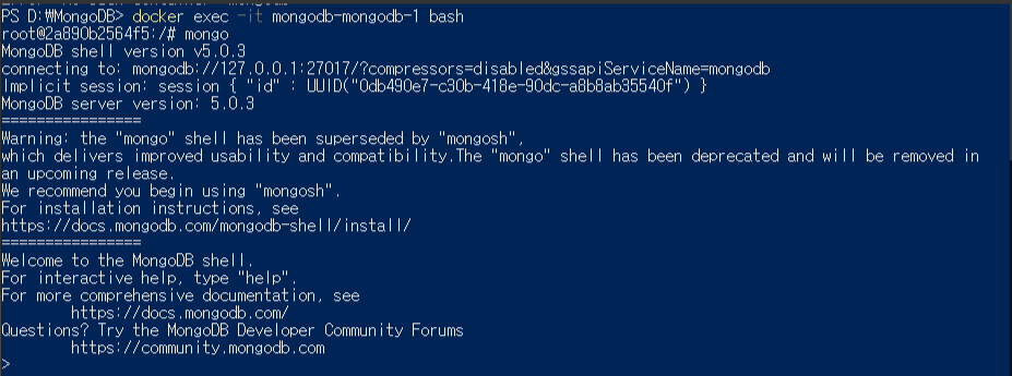 제일 쉬운 방법은 컨테이너로 접속하여 내부에서 MongoDB에 접속하는 방법이다.